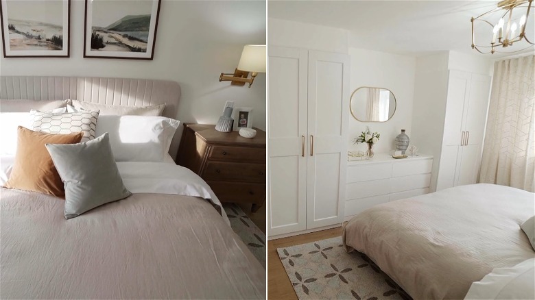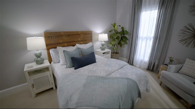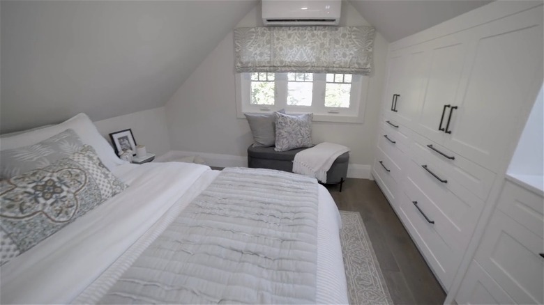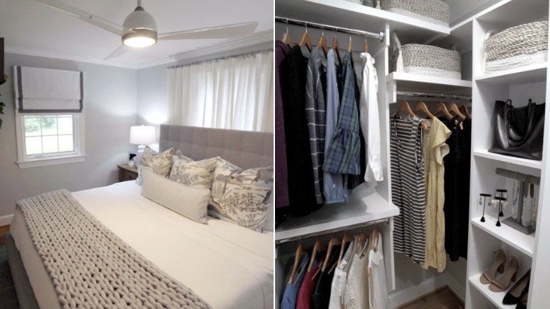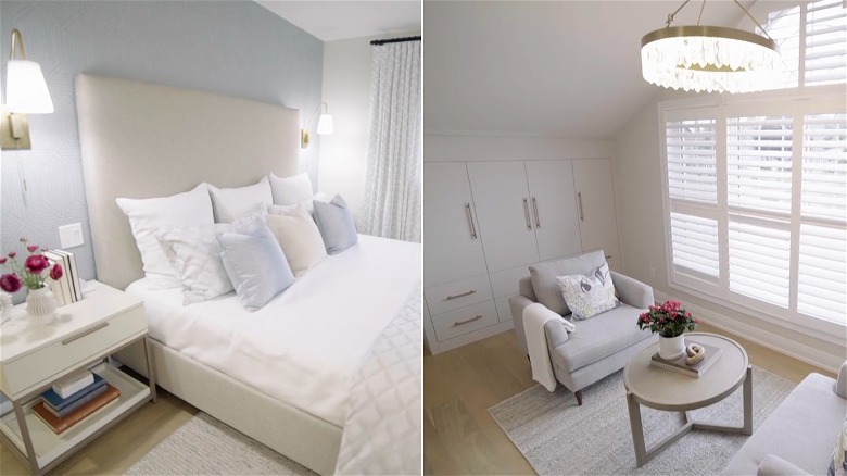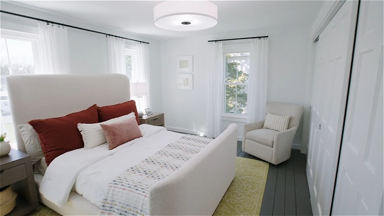 In Season 19, Episode 8 of "Love It Or List It," Farr worked her magic on a builder-grade home to make it feel more designer. Before the HGTV star arrived on the scene, homeowners Anju and Kieran were living in an uninspired master bedroom. It had beige carpets, stark white walls, and barely more than a bed in the space, despite having lived there for two years. Anju, in addition to disliking the scanty bedroom design, was also dissatisfied with the limited closet space. The two separate closets on the opposite wall of the bed created a his-and-her wardrobe that was less functional than it sounded. "The closets are small and also separated. It's just a strange layout and design to me," she said in the episode.