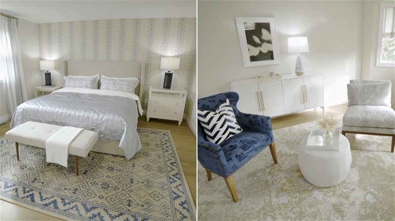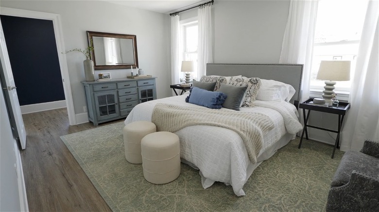 Putting your home office in your bedroom is usually a bad idea, so Farr did away with that setup. The end result was a modernized bedroom that perfectly showcased her design skills. Other than tearing out the carpet, Farr didn't have to do much to this particular space. She did enlarge the ensuite bathroom in order to install a shower and a luxurious soaker tub, but even more impressive was the way she styled their new oasis. The room was divided into two sections, each part anchored by an area rug. One half was dedicated to the bed, and the other housed a type of sitting room. She also made the theme blue because it's "one of the most calming colors," according to Farr in the episode.
