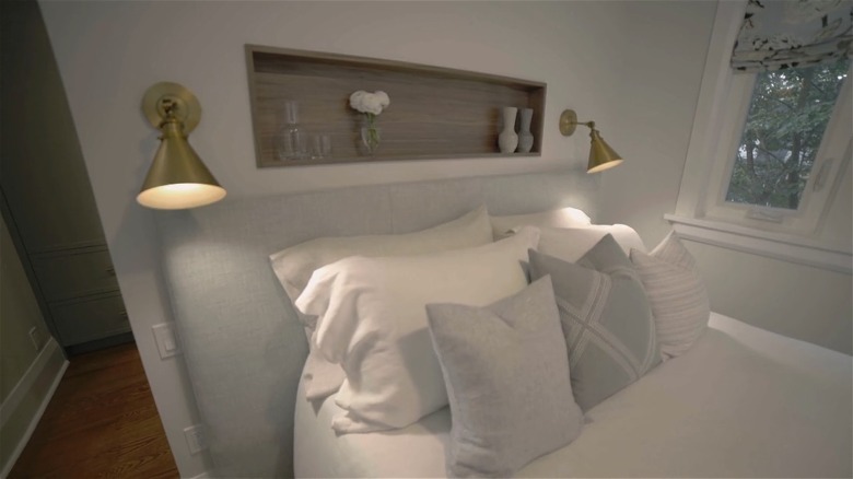 To increase the size of the closet, Farr brought the wall of the closet forward three feet and moved the door to the side. This was no easy feat, as the wall was load bearing and required a steel beam to be installed in the attic. The couple didn't have the budget to pay the $3,000+, so Farr instead kept the original wall inside the enlarged closet and created a his-and-her type of space. This might have made the room smaller, but it created some much needed storage space. While the primary bedroom might have shrunk, it was still filled with thoughtful details that made it stand out. For example, while there wasn't enough room for nightstands, Farr made a walnut-lined niche in the wall to make up for it.