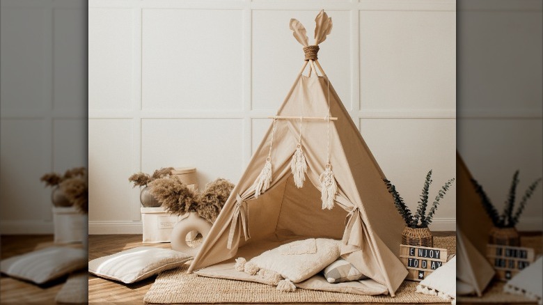 To give your child's space a cozy atmosphere, you could add a teepee tent. These could also provide you with a great opportunity to let your preferred style shine — for instance, the above tent would look great with boho or Scandinavian styles.