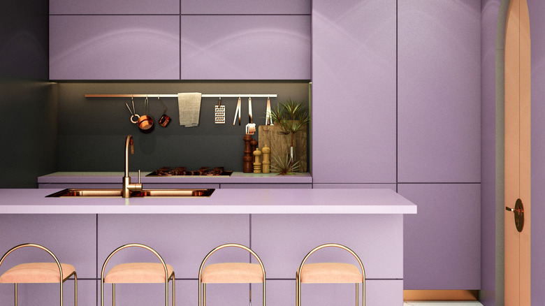 Another bold color combination for your kitchen is soft purple and gold. Mix with lots of greenery and wood clutter for a more eclectic but stylish look.