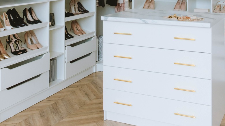 Islands are an excellent way to create more storage space in your closet. Plus, they provide a display area for jewelry and other small accessories. However, there are some things you need to consider if you're installing a pre-made one or building it yourself. The first is whether or not you have room in your closet. According to Tailored Living, you'll need at least 36 inches of space to walk around your island. Typically, you need a 12 by 13-foot area, but there are some workarounds if you have a small closet and want to add an island. These include one-sided islands or a modified version against the wall.