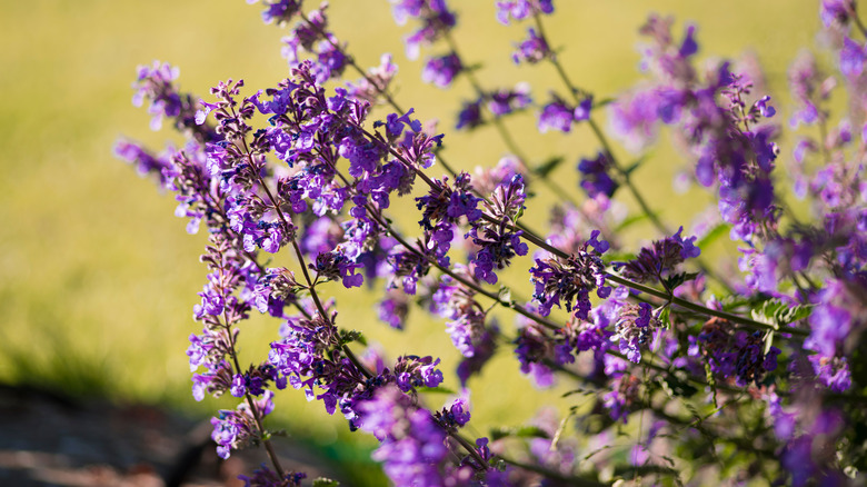 Garden catmint (Nepeta × faassenii) is a clump-forming perennial that shows off fragrant green leaves and purple flowers in the spring, summer, and fall. As described by Missouri Botanical Garden, this sterile hybrid version of catmint is a mix between Nepeta racemosa and Nepeta nepetella. It should be grown in sandy soil that retains little water for the best growth.