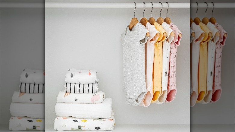 Natural Baby Life recommends hanging certain items and folding others. For instance, they say that tops like shirts, jackets, sweaters, and sweatshirts are easy to hang. Additionally, hanging up dresses, bodysuits, and rompers will keep them from getting wrinkled. Further, it's a good idea to fold pajamas, pants, shorts, and onesies, as all these items are easier to tuck away in a drawer. You'll also most likely keep socks, headbands, and other smaller items in a dresser or in bins.
