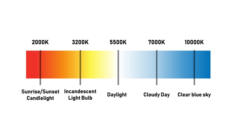 The color of a light bulb is determined by its number on the Kelvin (K) temperature scale. According to Lowe's, bulbs with a higher number will appear more white or blue, while those with a lower number will appear more yellow or red. In other words, a higher Kelvin number means a cooler tone, while a lower number means a warmer tone.