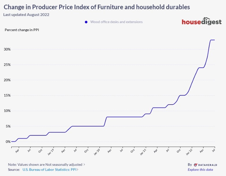 Since April 2018 there has been a notable price increase on furniture and other household durables, as demonstrated in data provided to House Digest from the U.S. Bureau of Labor Statistics. In that period of time, costs have escalated by more than 30%, in conjunction with the heightened prices on lumber. This translates to changes in the furniture business, in which wooden desk prices are steeper than ever. Depending on materials and the amount used, you could be paying anywhere between $250 to $1,000 for a solid wood desk, according to Rooms Solutions.