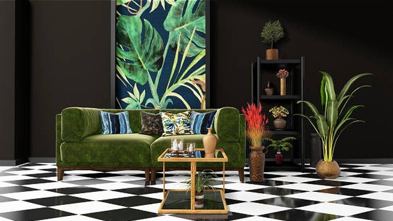 You might define a space with an assortment of colors and textures. This velvety emerald couch takes centerstage amidst a black and white checkered floor. The greenery present in the planters and picture gives the space depth with its various shades of green. Blue and red accents also appear in the pillows and plant décor.