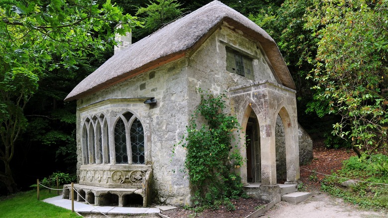 Imagine frolicking through the woods and coming upon this tiny stone English cottage with exquisite gothic architecture, which takes this abode up a notch. It even has stone bench seating with intricate details, ideal for respite throughout the day.