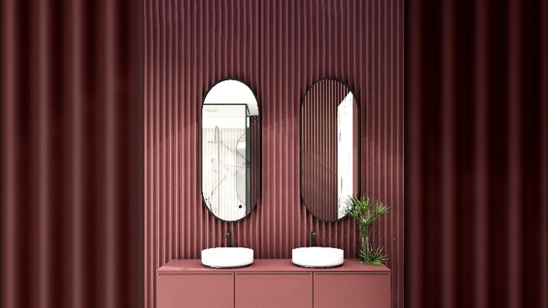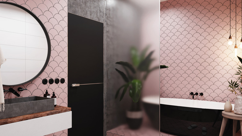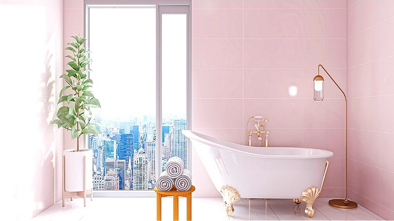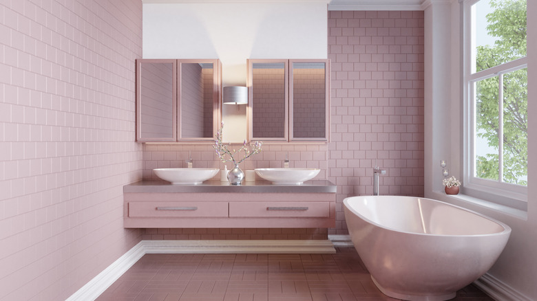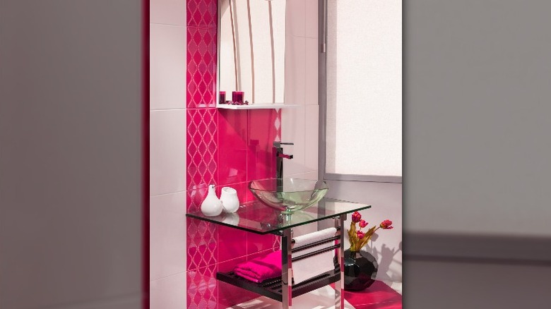 If you're in the camp of people who love the color pink, consider incorporating it in your next bathroom remodel or design. With its soothing and gentle psychological properties (via Verywell Mind), combined with its decorative versatility and appeal, you can't go wrong with adding pink to your bathroom — whether it's a touch or a swath. Being such an adaptable color, it can be used in any variety of ways, in any number of shades or saturations, etc. Keep reading for ideas on how to make your bathroom a pink-inspired haven.