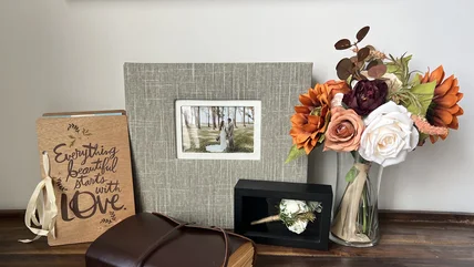 To display decorative items from your wedding day around your home such as corsages, you can use a shadow box. The small model above — which displays the groom's boutonniere — was purchased from Hobby Lobby, and there are lots of other sizes and colors to choose from.