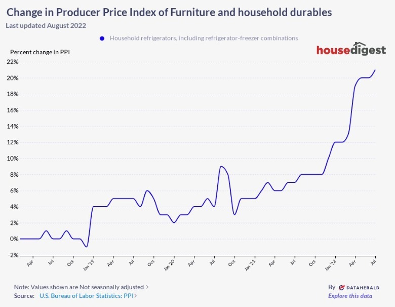 If you've been shopping around for a new fridge, you've probably noticed the exorbitant prices on kitchen appliances as a whole, and you're not the only one. The U.S. has experienced a drastic price increase on refrigerators over the past three years. Beginning in April 2019, the cost of furniture and other household durables has gone up by a colossal 22%, and 17% since January 2021, according to House Digest data. So, who or what is to blame for these outrageous prices — chances are you already have an idea.