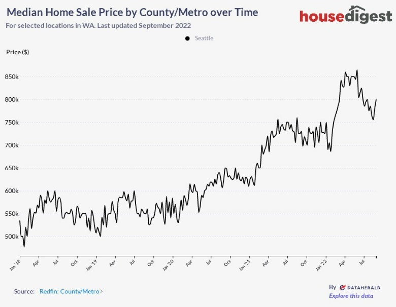 Recent data compiled by House Digest determines that the median price for a home sold in the Seattle area in the winter of 2018 was as low as $477,000. In May of 2022, the average price rose to $865,000, which is an increase of about 81%. By August, the average sale price had dropped to around $755,000. Several analysts predict that this trend may continue. "I predict prices will drop further as we move into the fall," explains Matthew Gardner, Chief Economist at Windermere. "The market is simply reverting to its long-term average as it moves away from the artificial conditions caused by the pandemic," via Northwest Multiple Listing Service.