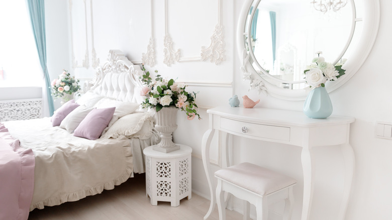 Another popular choice in princess rooms is princess-themed furniture, such as those sold at Rooms To Go. Each piece has delicate details and soft edges; some even have heart shapes or swirls. However, while you could purchase these items, you could also curate your own space with some vintage furniture and other pieces that aren't made specifically for children's rooms. For instance, Christi Lukasiak uses a golden canopy bed with lots of delicate details that incorporate a royal feel. She also adds vintage, mismatched dressers that bring in lots of personality. And she includes an upholstered chair with a luxurious-looking pattern in the corner. Mirrors with rounded edges always look stunning, and lamp shades with hanging crystals are also a great choice.