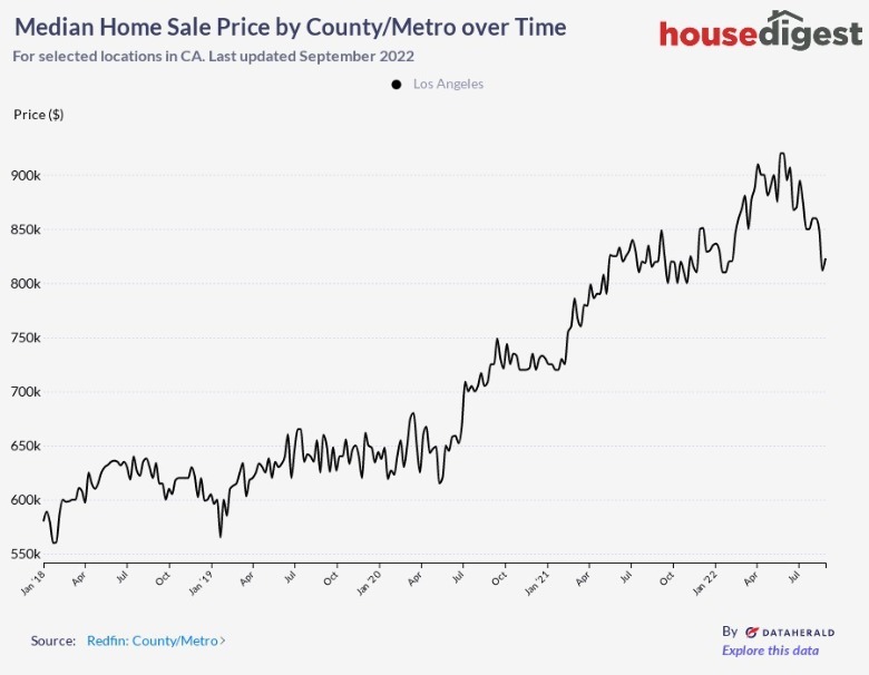 As seen in the above graph made with data from Redfin, from around the middle of 2019, the median house price continued to rise in Los Angeles; In June of 2022, it rose slightly above $900,000. However, since then, prices have been dropping, and in August, the median price dropped to around $810,000. While the numbers are still nowhere near where they were in January of 2018 (when the median price was $580,000), they have started to trend down.