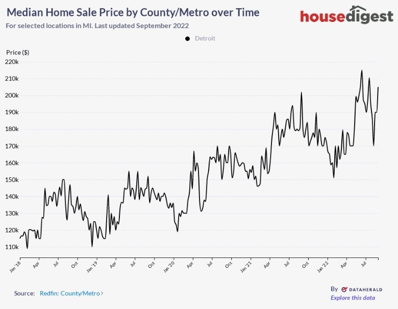 The cost of homes in Detroit has had some interesting ups and downs. Home prices have tended to peak during the summer months, perhaps because the frigid winters deter people from moving to or within the icy city. Although home prices can rise and fall dramatically in the span of a year, the overall trend from 2018 to today shows that homes in Detroit are becoming more valuable. In early 2018, you could easily purchase a house in Detroit for as little as $115,000. Now, it's more common to see houses in the $200,000 range.