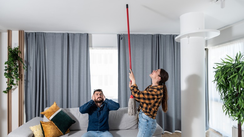 While there's no law that legally forces neighbors to be quiet, there are ways to keep them from continuously being loud. According to legal advisers at Nolo, if your neighbors repeatedly disturb you, you can sue them in court. Of course, you'll need proof that they disrupted the peace in countless moments. You might be able to receive money for damages from your neighbors, which is sure to make them more aware of their volume. However, it can be time-consuming and inconvenient to go through the legal process. Otherwise, you can check the fine print of your lease to figure out the rules around noise levels in your building. If your landlord can't offer any solutions, we know a few tricks for dealing with noisy upstairs neighbors without having to cause a confrontational scene.