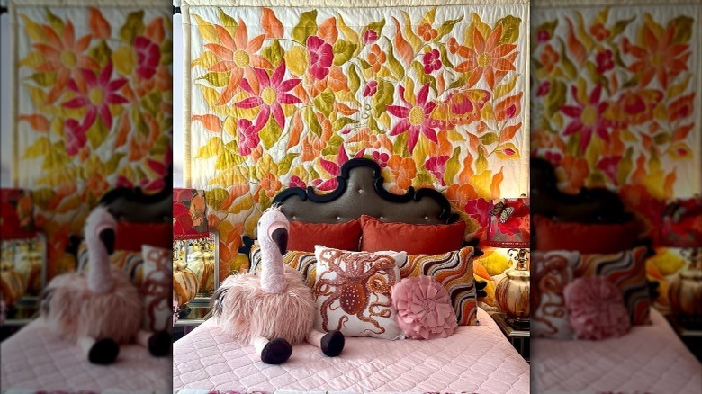 The things that make a maximalist interior are all the witty knick-knacks you can find that make you smile. They don't have to have a purpose except to be bright, flashy, and unusual. So this bedroom is filled with various random doodads, such as bird-themed décor and ceramic items.