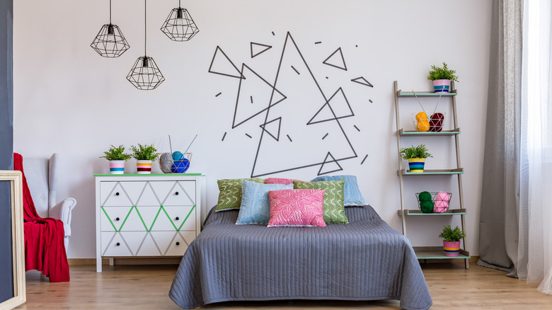 Patterns play a massive role in maximalism. There are hanging light fixtures, a shelving unit, a diamond-themed dresser, and a lively geometric wall design. So when we mentioned a flow of pattern, this bedroom knew what we were talking about. The triangular and diamond shapes blend with their sharp angles, adding a striking look to the space.
