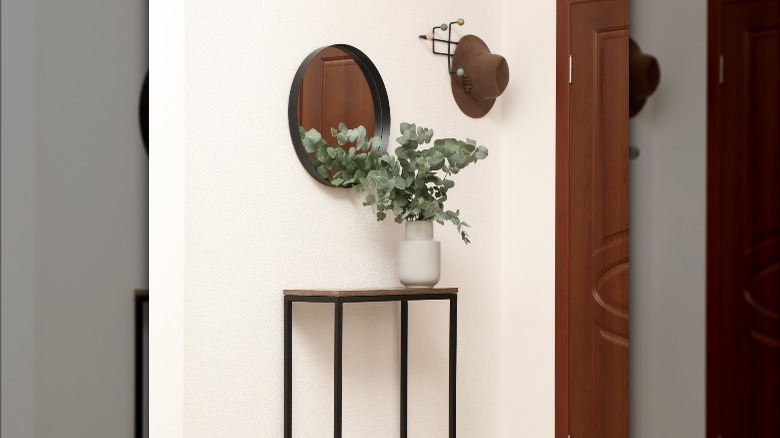 Including a mirror in your entryway will allow you to see how you look before exiting your home. To maximize the usefulness of a full-length mirror, place it on top of a short cabinet.