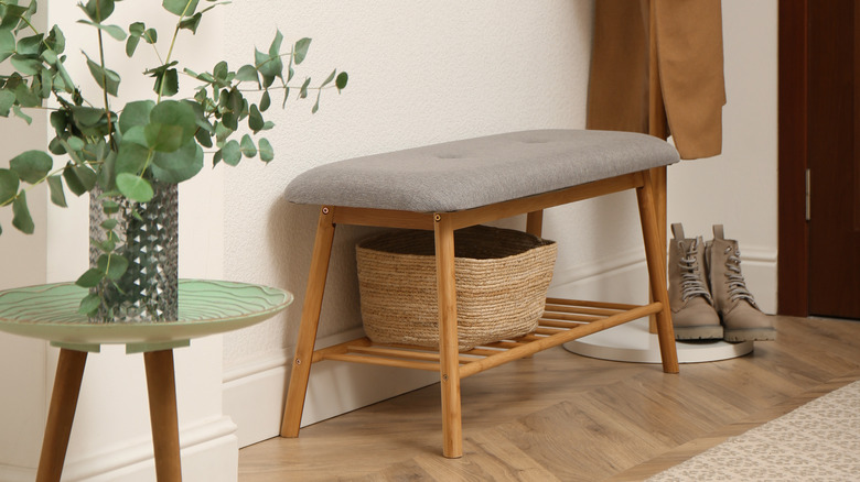 The above storage bench has a bottom rack that's typically used for shoes. However, some may not want their shoes to be left out in the open, as this can create a disorganized look. If so, they could place them inside a basket and store it on the bench.