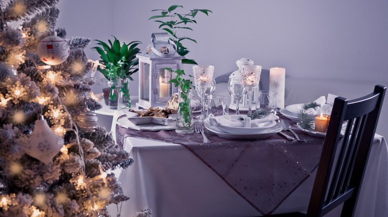 Showcase lavendar tones using a tablecloth, napkins, or other linens as seen pictured above. Throw in some silver tones for the table to appear extra dreamy and festive. To create a magical feeling, you might also include sparkling elements through crystal candlesticks or glitter décor. White, snowy elements also go well with this color scheme and can soften up the ensemble.
