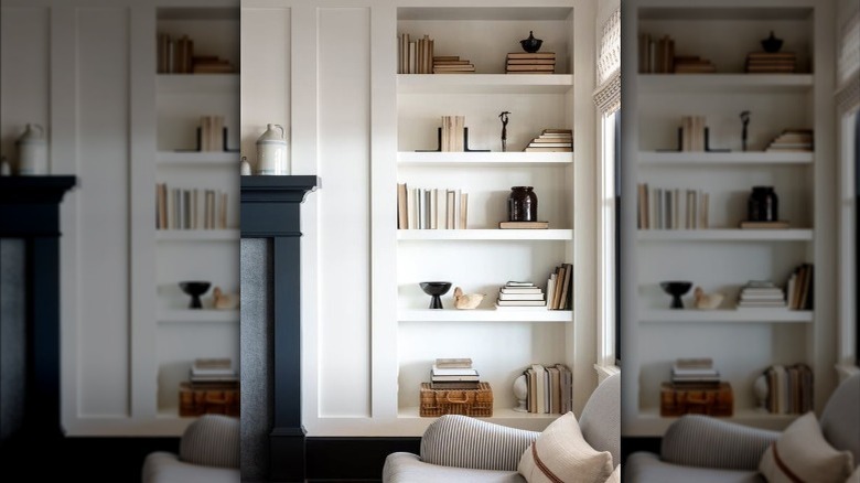 On the other hand, homeowners who enjoy a bit of color in their homes or like reading the titles of books disagree with the backward book trend. According to Food52, showcasing colorful spines are a great way to add interest to a home. Some folks enjoy arranging the books' spines in color to give their shelves a different look. Of course, there's no right way to design bookshelves if you decide to display the pages or the spines — as long as you decorate the shelves in a way that feels right for you.