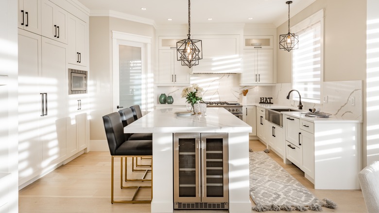The House Digest survey also offered other design options that resonated with a number of homeowners. Approximately 9.5% of respondents said they'd select a single-wall kitchen as their ideal kitchen layout, while 8.4% were drawn to galley-shaped kitchens, and just over 8% would pick the island's sister kitchen feature, the peninsula. This last option, per The New York Times, may be a better choice for homes with more limited living space, especially since as designer Jessica Nicastro put it, "To me, having a small island is like wearing pants that aren't long enough."