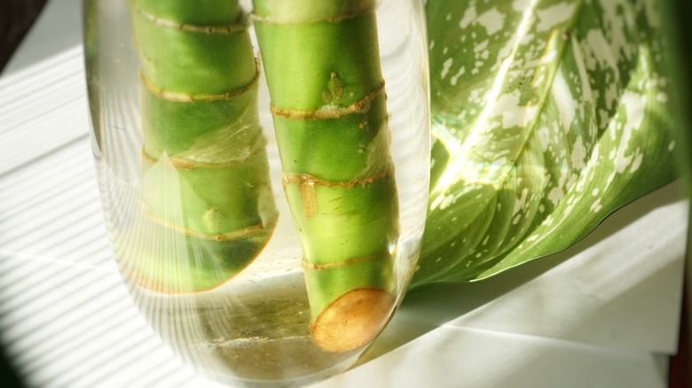 Lucky bamboo (Dracaena sanderiana) is one houseplant that is almost always grown in water without soil. Many recommend that you grow the stems of false bamboo with a substrate, like coarse gravel or pebbles, submerged in water. As told by Missouri Botanical Garden, the lucky bamboo plant should have some material at the bottom of its glass so its roots have something to grip onto.