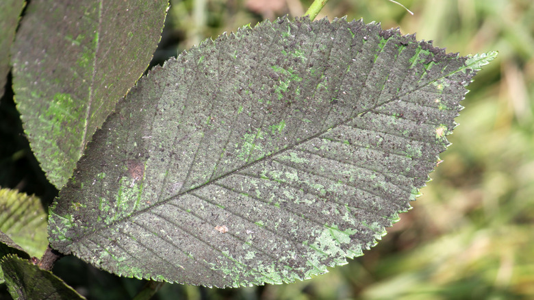 Aphids are the bane of many a home gardener, and for good reason. They swarm young flower buds, can stunt the growth of your plants, and leave behind sticky sugar-packed residue that invites ants and yellowjackets to join the insect invasion. Called honeydew, the residue doesn't directly harm anything itself, but the University of Minnesota Extension warns that it can compound your issues by creating an environment susceptible to a fungus called sooty mold. As seen in the image above, sooty mold covers leaves in unattractive black spots, but it is not an actual disease.