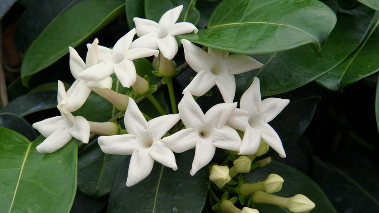 This tropical vine grows clusters of small white flowers that are incredibly sweet. Its name is derived from the Greek Stephanos, meaning "crown," and otis, meaning "ear." This name supposedly came to fruition because the flower stamens resemble a certain part of the ear anatomy. Clip a 4 to 6-inch piece of vine right under a node and dip it in rooting soil. Make sure that the soil is moist and drains well. It should root in six to eight weeks. You can also clip under the node and put it in water along with liquid plant food.