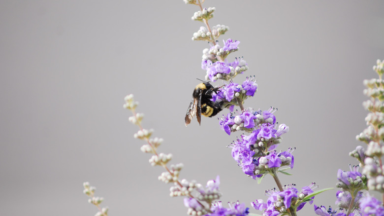 To do our gardener's best to attract the bees while simultaneously doing our homeowner's best to protect our wood structures from carpenter bee infestations, it is helpful to know how to spy a carpenter bee in the first place. First off, they look a bit like their bumble bee cousins. Carpenter bees have a slight yellow fuzz, but on closer inspection, PennState Extension points out they have slick black bodies. These species are also notably more solitary than other bees, so your first sighting of carpenter bees will not likely be a big communal crew of buzzing bees.