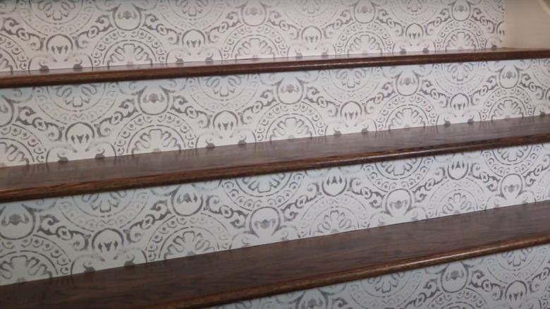 To provide more personality, they cut peel-and-stick wallpaper to fit on each riser, which gives the whole space a brand-new look.