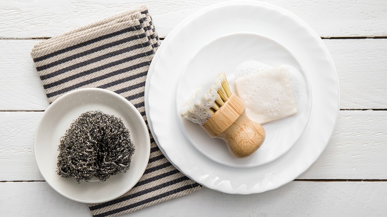 The New York Times suggests that a better way to complete the task and save on soap is by plugging the drain and filling your sink with water first. As the faucet is flowing, add about a teaspoon of dishwashing liquid under the running water to create a nice sudsy bath for your pots and pans to soak in while you scrub. Start with silverware and plates before you clean large dishes, as things like casserole dishes tend to be dirtier and require more elbow grease. Filling the sink with soapy water ensures each item will get a fair amount of cleaning action and prevents you from losing suds down the drain as you work.