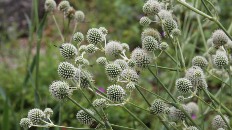 Rattlesnake master (Eryngium yuccifolium) is named for its use by Native Americans who relied on the root to remedy rattlesnake bites. Now we know this is a misconception, but it is true that the plant was used medicinally in the past. Today, the rattlesnake master is grown ornamentally for its golf ball-like flowers that attract bees, flies, wasps, and butterflies along with dragonflies.