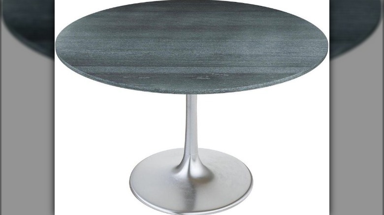 The round Metropolis dining table from One Stop Bedrooms is $1,815 and features a dark gray color with undertones of blue and green. This is an excellent option for dining rooms designed with similar hues. For instance, with complementary dark turquoise chairs.