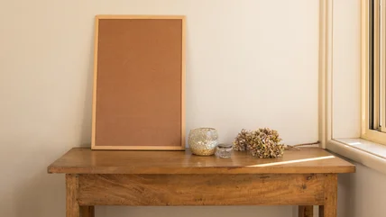 Another way to cover a cork board wall is with fabric. Maximalists could use a bold pattern, while minimalists may want to stick with a neutral, solid fabric, such as in the image above. If you want to elevate the cork wall, you could include a border on the edge or make a frame from wood. Once your wall is looking how you desire, you can cover it with reminders and decorate it with artwork or photographs.
