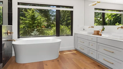 Hardwood floors are beloved by homeowners for their durability, clean look, and the warmth it brings to a space. However, certain areas of our homes, like bathrooms, experience such high humidity and moisture that hardwood floors languish in these conditions. Susceptible to warping, cracking, discoloration, mold, and mildew, it's wise to avoid this material in our bathrooms. Not to mention, we use so many different bath salts, soaps, and shampoos that are harmful to wood flooring alone. But don't worry; you can achieve the same chic style through wood-look tile and waterproof vinyl flooring.