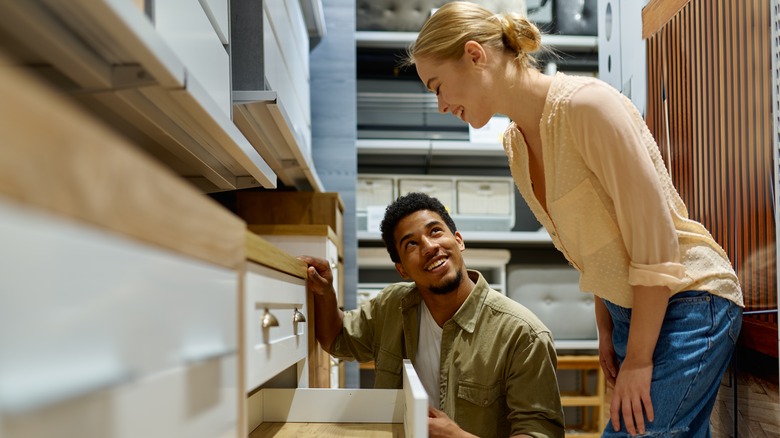 Browse various stores and providers so you can know your options in terms of prices and offerings, and keep your eye out for sales and clearance events at stores like Home Depot and KraftMaid, and online at IKEA and Amazon. By doing this, you can stumble upon low prices for overstocked inventory or styles about to be discontinued. Display models are also great, cheap findings because they are already put together and won't have much wear and tear.
