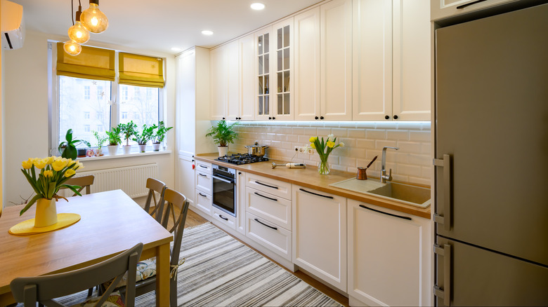 While kitchens require the normal necessities of appliances, storage, and a sink, additional decoration may sometimes be overlooked. Designer Bobby Berk loves exploring the details of styling the multi-functional room. As he puts it, "The kitchen is definitely my favorite spot to decorate and find new and exciting ways to make it special" (via Glamour). Whatever your style, make things personal. As a fan of warm neutrals and dark contrasts, Berk might showcase dusky cabinetry with white marble countertops along with floating wooden shelves. Other colors to consider within the cabinets or backsplash might be various shades of green, black, navy, or gray.