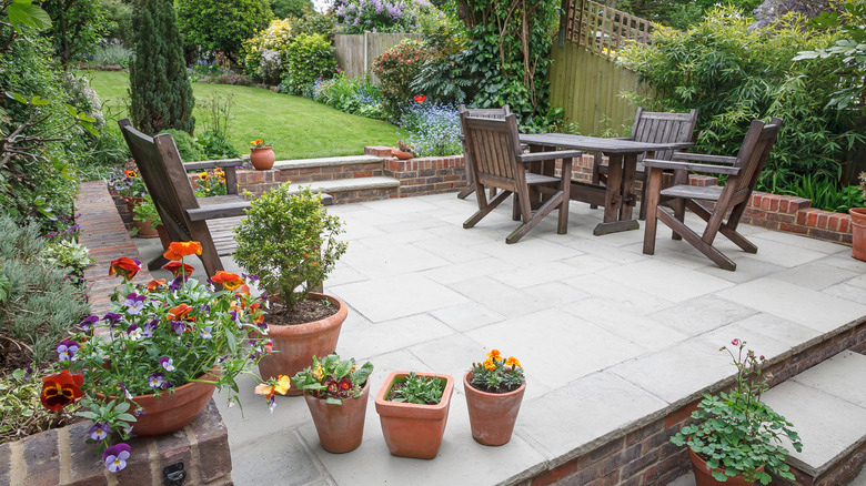 While the lush green grass may seem like a perfect and inviting spot for your wooden patio furniture, it's generally not recommended. That's because the moisture can wreak havoc on your outdoor seating, leading to its quick demise. Setting your patio furniture directly on grass can also damage the grass itself due to pressure, insufficient water, and lack of sunlight. Certain types of wooden furniture are also a haven for tiny insect invaders that will treat your outdoor loveseat as a place of refuge and worse.