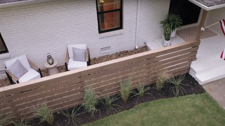 In the episode, "An Old Rancher Gets a Chef-Inspired Face-Lift," of "Fixer to Fabulous," hosts Dave and Jenny Marrs encounter this exact issue with their clients' home. Because the front porch offers no privacy, the Marrs are tasked with finding a way to conceal the area. Their solution? The couple created a little seating area behind a slatted wood fence designed with cushioned chairs and potted plants.