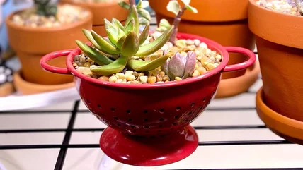 Using a colander as a planter adds to your home's decor while benefitting the plants since it's less likely for them to be overwatered with all the drainage holes around the container. However, this does mean that when it is time to water them, it can get a little messy.