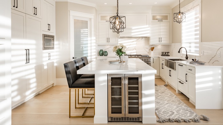 Drew and Jonathan Scott also believe that even all-white kitchens should have some color. "If people are going modern, they think of white everywhere, but maybe some contrast is good," Drew Scott explains in an interview with The Kitchn. Jonathan Scott adds, "Too much of a good thing is not a good thing. White is classic and nice as long as you don't go too ultra white on the cabinet." Infusing a little color helps make the design look a little more visually interesting. Jonathan Scott suggests an infusion of blues, greens, yellows, and grays among stained woods to add a pop to the room.