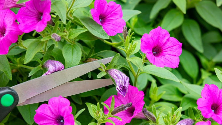 Pruning your petunias will aid new growth and avoid stringy, depleting foilage. You may notice long stems that have gone bare yet still wield one or two flowers at the end. These extended and mostly empty stems won't produce new growth and should be trimmed. When pruning, you will remove dead flowers, leggy stems, and sometimes portions of the plant that look perfectly healthy. A good rule of thumb is to cut back stalks that are 8 inches or longer right above a node. Performing this a few times a week will be plenty to help your petunias continue producing fresh blooms throughout the season.