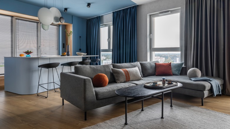 While dark curtains can look stylish in some living rooms, they aren't the most flattering idea in the majority of cases. Most people want their living rooms to feel lively, and a dark curtain tends to drain the room's light and energy. Dark colors and blackout curtains are great for bedrooms because they signal to your brain that it's time to wind down and produce melatonin. However, placing them in a household gathering space can dampen the mood and sap your energy too much. Black curtains may be the moodiest offenders, but that doesn't mean other dark colors are much better. "Avoid navies and other dark blue shades in a room that does not get much natural light," interior designer Carlin van Noppen warned Better Homes and Gardens, "They can appear dominating and will make the space seem even darker."