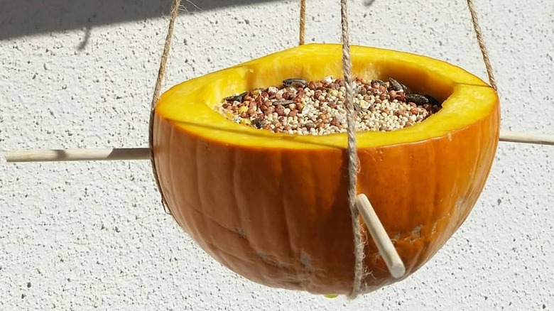 If you're enjoying pumpkin-spiced lattes, don't you think your feathered friends should enjoy a little pumpkin treat themselves? There are a few different ways to turn your pumpkin into a bird feeder. The first is easiest and requires a medium-sized pumpkin, a few small sticks, twine or rope, a drill, and, of course, bird seed.