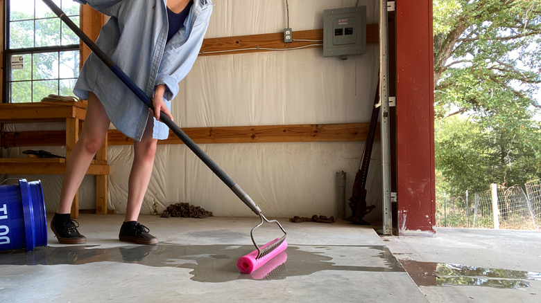 Because a floor squeegee is most commonly used to push water out of a building, we tested the DIY floor squeegee in a garage with unsealed concrete floors. To simulate a spill accident or water leak, we filled a 5-gallon multipurpose bucket with about 1/2 gallon of water, then tipped it over on the floor. While it might not seem too important in a garage, it's not good to let water soak into your concrete, as it can decrease its durability and even foster mold. Luckily, we had our DIY squeegee hack ready to roll!