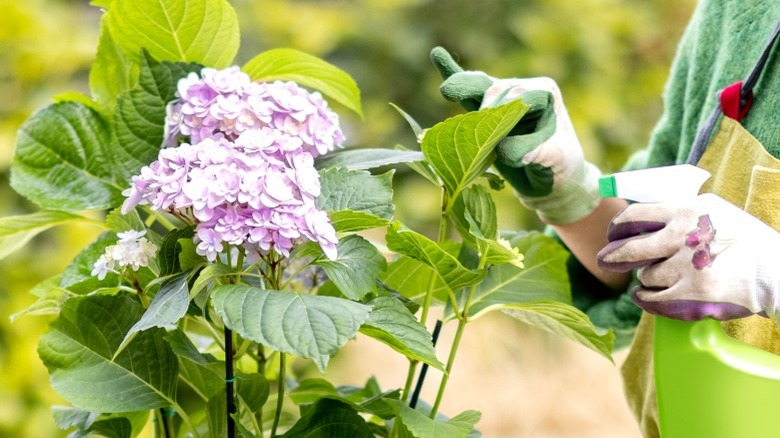 To keep deer from eating your hydrangeas, you can mix a quick repellant spray using a few ingredients from your kitchen. One option is to combine garlic cloves, onions, and water, while another involves using whole eggs and water. To create this latter, strong-spelling spray, in a blender, mix 1 egg with a quarter-cup of water, creating a foam. Add the mixture to a half-gallon spray bottle and once the foam comes down, add more water to fill the bottle.