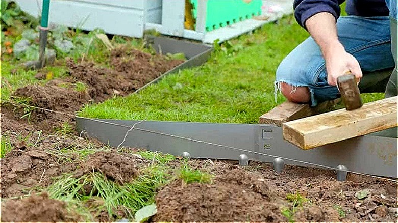 Your rubber mallet steps into the limelight next, driving the stakes into the ground on either side of the metal lawn edging. Remember, too many actors can overcrowd the stage, though, so stick to one stake for roughly every 30 inches of metal sheet. Burying your stakes at a depth of 4 inches guarantees stability. When bridging gaps between strips, position the stake outside the edging to cleverly obscure the union. Finally, refill the trench with soil and make sure no sharp corners are left uncovered.