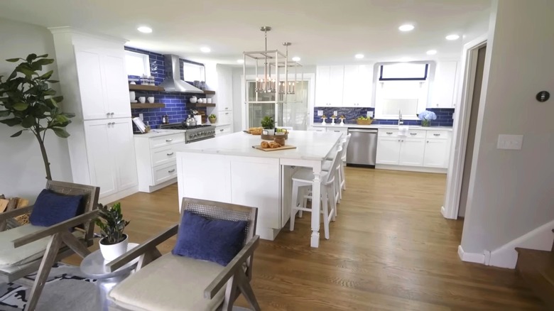 The total transformation included many areas of the house, but this little trick makes the kitchen the show-stopper. Removing the small wall allowed for more usable kitchen space, as well as improved flow throughout the kitchen and the rest of the home. The effect is an airy feel that makes the room more functional for the family. It also creates a freshly renewed vibe and takes a once dim space and fills it with light. Farr says, "It's the smallest things sometimes that can make the difference."